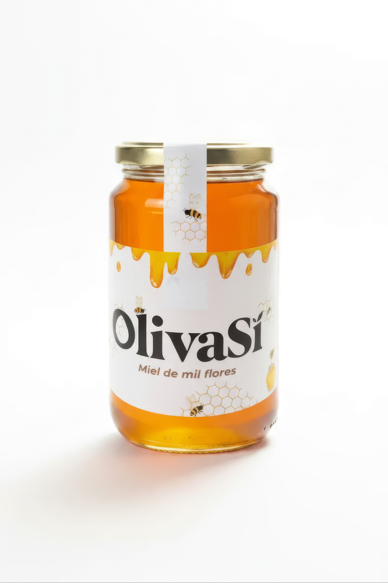 La Miel Mil Flores de OlivaSí es una miel 100% natural obtenida a partir de distintas floraciones estacionales. Su perfil es redondo y amable: dulce equilibrado, notas florales y ligeros matices de monte que recuerdan a tomillo y jara. Su color ámbar claro puede variar según la campaña, y cristaliza de forma natural con el paso del tiempo, como hacen las mieles auténticas.